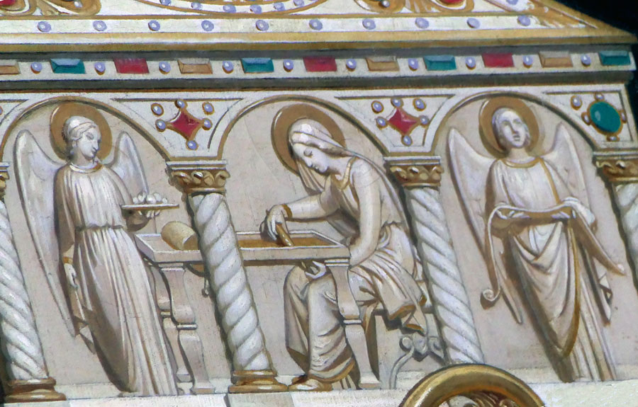 It is an elaborate reliquary showing, in the centre, the Virgin Mary, seated at Her loom, between two angels who serve Her, while She weaves the tunic of Her Son: “A beautiful piece of cloth, like the tunic of the high priest in the mosaic liturgy. The Church is represented by the garment that the Virgin wove for Christ, the seamless tunic, the fruit of His sacrifice. This robe remains untouched to show us that until the end of the world, the Church, one, holy, catholic and apostolic, will remain the eternal work of the Virgin Mary.” (sermon by Father de Nantes, April 18, 1992)